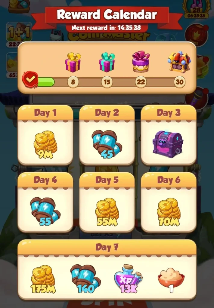El juego Coin Master tiene una emocionante función conocida como Calendario de recompensas. Ayuda a los jugadores a ganar giros gratis y monedas diarios tan pronto como inician sesión en el juego. Solo tienes que abrir el juego todos los días para ganar una pequeña recompensa y, si eres constante, las recompensas seguirán mejorando para motivarte a abrir el juego a diario.